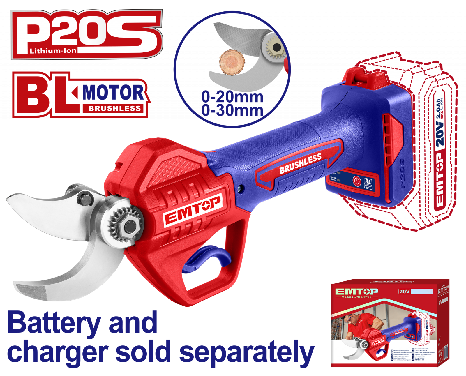 Foarfeca electrica pentru vie fara acumulator si incarcator, motor fara perii (brushless), 20/30mm – ELSL20305, EMTOP