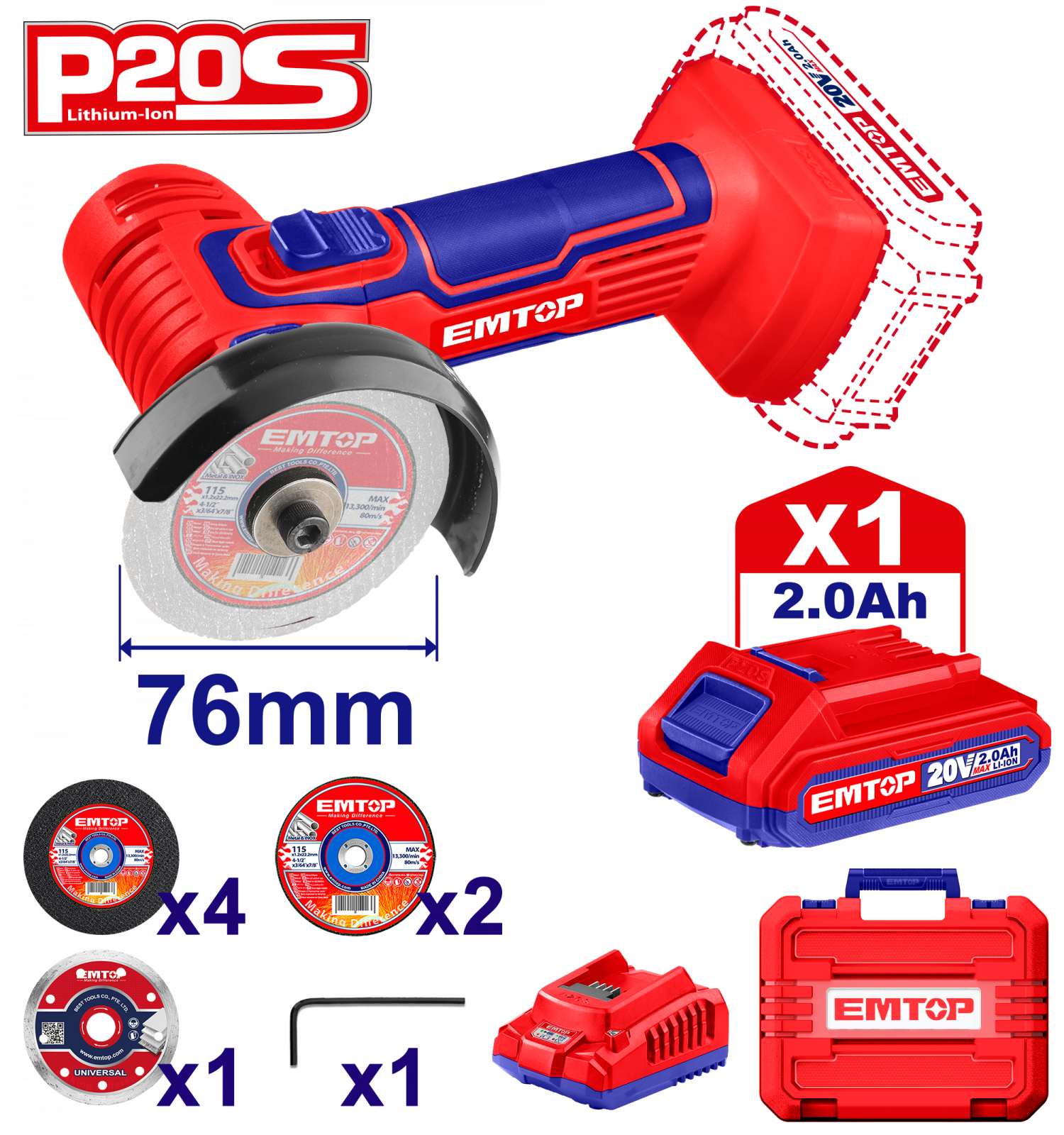 Mini polizor unghiular cu 1 acumulator 2.0Ah, 76mm, 7 discuri incluse – ELAG76017, EMTOP