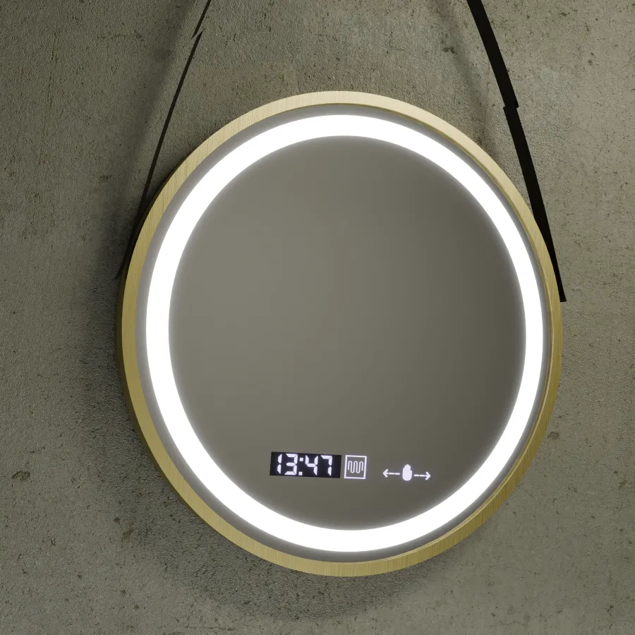 Oglinda LED Senzor MotionGlow Fily Rotunda Diametru 60 cm Lumina Rece/Calda/Neutra Dimabila Sistem Dezaburire Termometru si Ceas Rama Auriu Periat cu Curea Piele Ecologica
