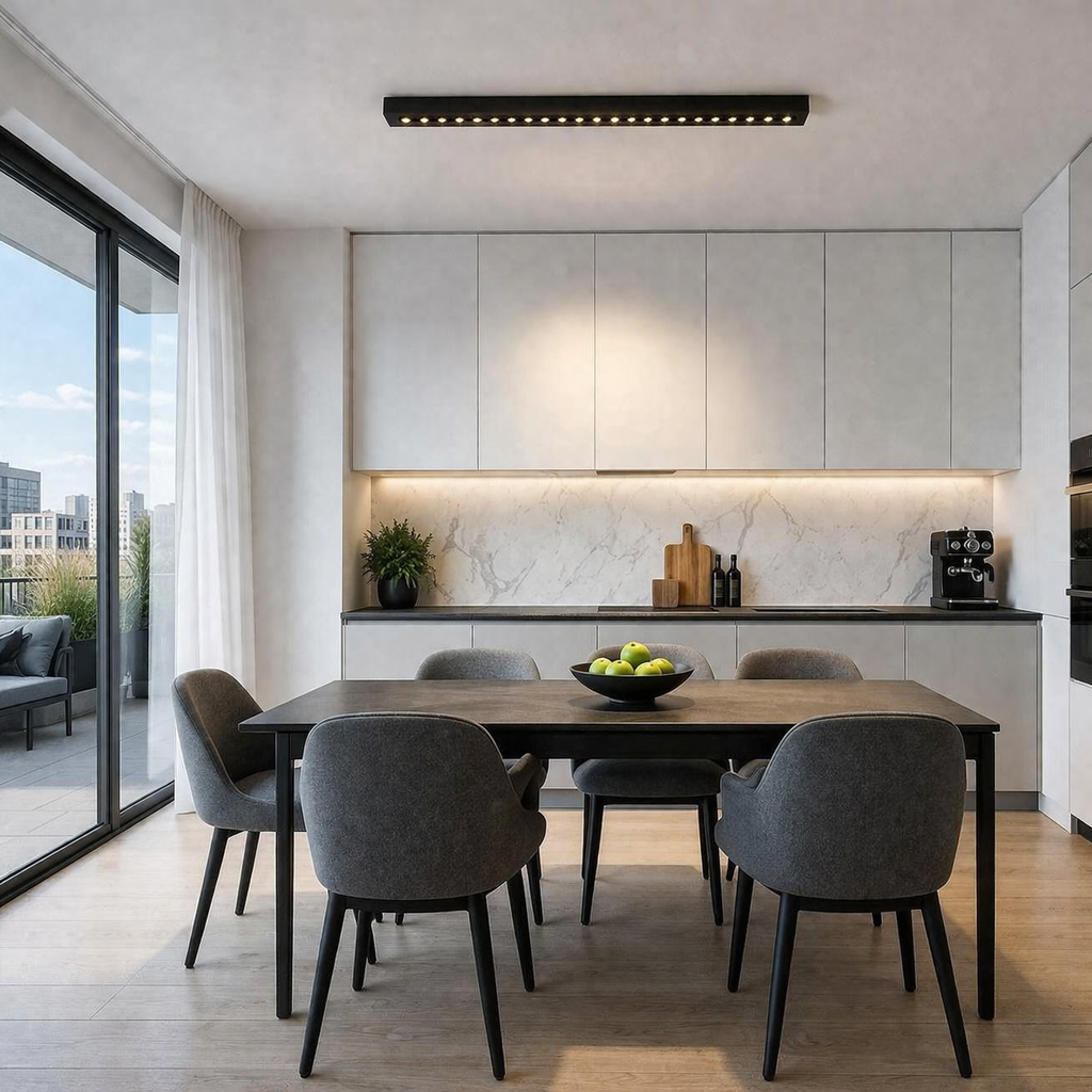Proiectorul LED liniar aplicat cu grila, 24W si 20 surse de lumina, este o solutie compacta si eficienta pentru iluminatul de accent in spatii rezidentiale sau comerciale. Designul sau liniar, cu dimensiuni reduse (54 x 3.5 x 6.5 cm), permite integrarea discreta pe tavan, oferind in acelasi timp un efect vizual modern si bine definit. Cele 20 surse LED sunt dispuse uniform si protejate de o grila speciala care reduce efectul de orbire (anti-glare), directionand lumina precis catre zona dorita. Este ideal pentru iluminarea punctuala a obiectelor decorative, rafturilor, vitrinelor, tablourilor sau pentru evidentierea anumitor zone dintr-o incapere. Cu o putere totala de 24W, proiectorul asigura un consum redus de energie si o eficienta ridicata, fiind potrivit pentru utilizare indelungata. Tehnologia LED integrata ofera durata mare de viata si costuri minime de intretinere, facandu-l o alegere practica pentru proiecte de amenajare moderne. Montajul aplicat il face usor de instalat pe diverse tipuri de tavane, fara interventii complexe. Datorita dimensiunilor compacte si designului minimalist, acest proiector LED liniar este potrivit atat pentru locuinte, cat si pentru birouri sau magazine unde se doreste un iluminat tehnic, precis si elegant.