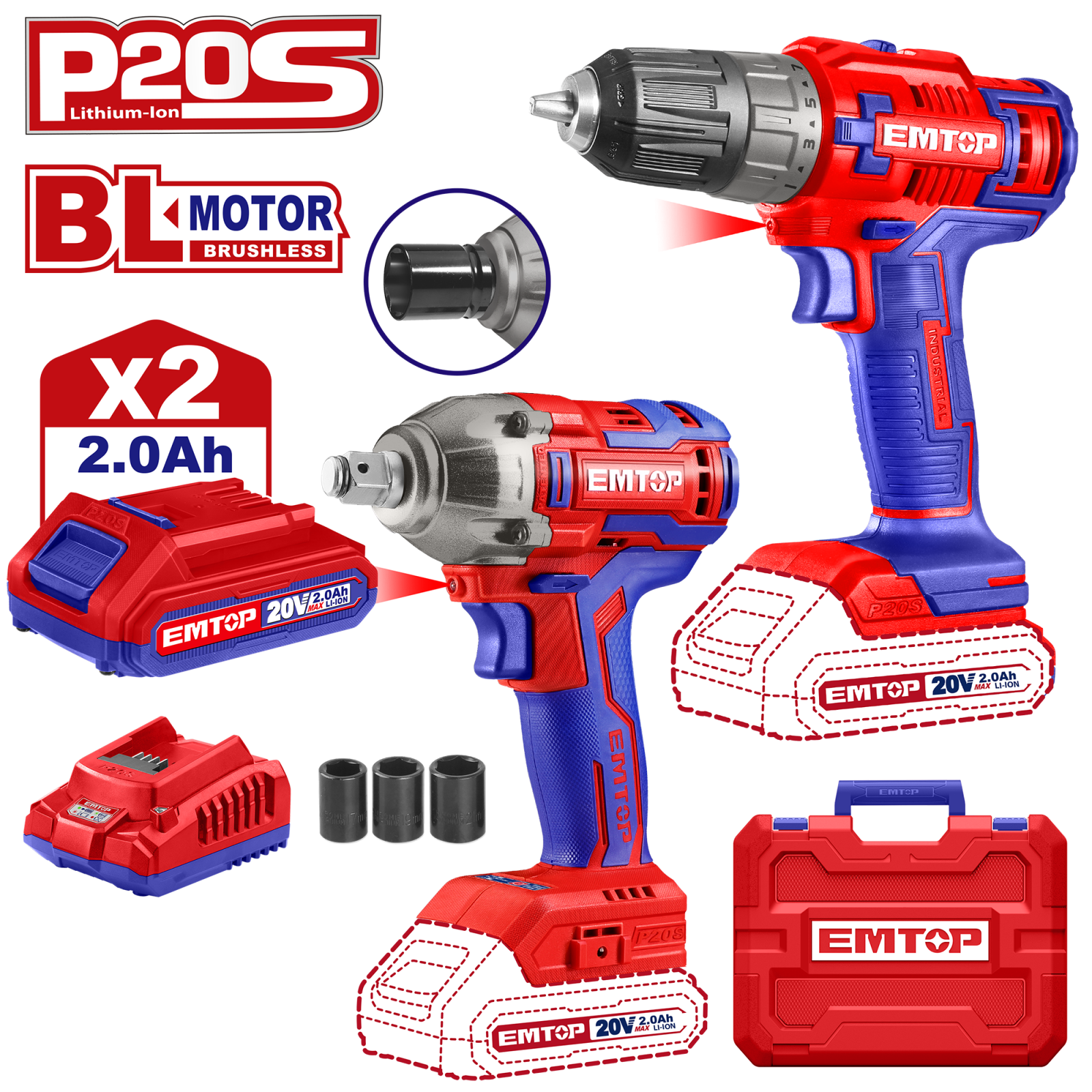 Set 2 buc. bormasina de insurubat si impact cu 2 acumulatori 2.0AH, 3 accesorii, cutie de transport – ECKL20072, EMTOP